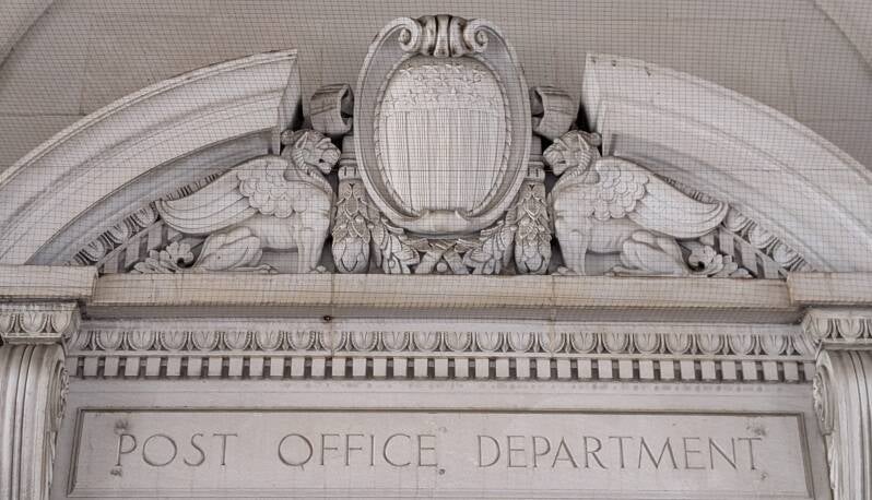 Министерство почт было одним из четырех первых министерств США, наряду с Госдепартаментом, Министерством финансов и Военным министерством. Однако в 1971 году оно прекратило существование на министерском уровне. Парадный вход с уже устаревшей надписью был изготовлен в 1903 году.