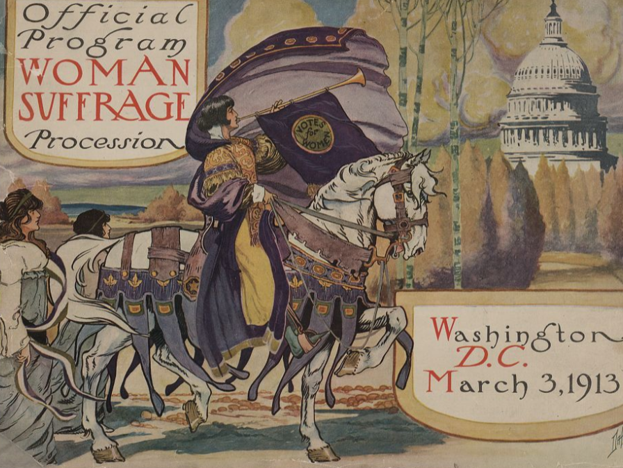 Плакат 1913 года: демонстрация суфражисток в Вашингтоне. Американки добились избирательных прав в 1920 году. Фото: Library of Congress
