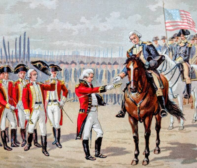 Джордж Вашингтон приобрел статус полубога после того, как принял капитуляцию британской армии в 1781 году. Это поражение заставило Британскую империю признать независимость США. Картинка из американской детской книжки, изданной примерно 150 лет назад, изображает это событие: Вашингтон сидит на коне, возвышаясь над британским командующим, лордом Корнуоллисом, который предлагает ему шпагу. На самом деле, все происходило несколько иначе - военные общались, как равные, а Корнуоллис сперва предложил шпагу союзнику Вашингтона - французскому генералу Рошамбо, а не американскому генералу, которого считал мятежником. Рошамбо отказался принять шпагу, указав на Вашингтона, а Вашингтон приказал принять ее своему заместителю.