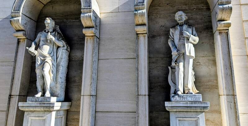 Cтатуи итальянских гениев на фасаде итальянского культурного центра.
